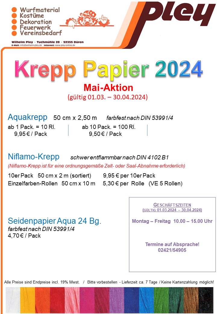 SondergeschäftszeitenKarneval(06.01.2025 - 29.02.2025)Mo - Fr 11.00 - 18.00 Uhr Sa 09.00 - 13.00 Uhr ----------Krepp-Aktion(01.03.2024 - 30.04.2024)Mo - Fr 10.00 - 15.00 Uhr